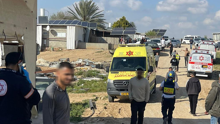 Les EMT et paramédics MDA soignent et évacuent vers Soroka : un homme quarantenaire en état modéré blessé par l’onde de choc avec lésions aux membres, une femme de 26 ans et un nourrisson de 2 mois en état léger. D’autres équipes MDA fouillent les lieux signalés pour écarter d’autres victimes.