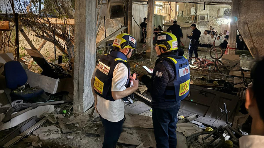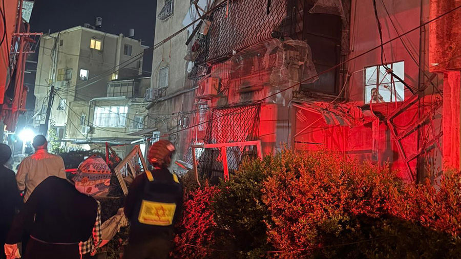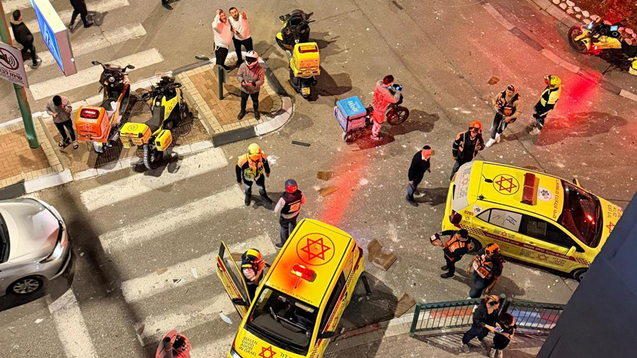 À Bnei Brak, les EMT et paramédics MDA soignent et évacuent 9 victimes vers les hôpitaux Beilinson, Schneider, Sheba et Maaynei Hayeshua, dont : un homme de 23 ans en état modéré blessé par éclats, et 8 en état léger avec blessures par onde de choc et éclats, incluant 6 enfants.