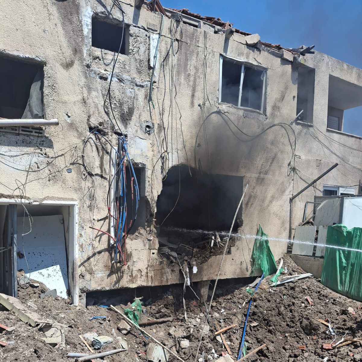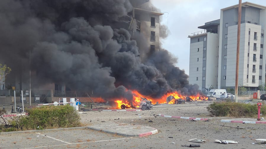 Suite à la frappe de missile dans le Néguev, qui a touché à proximité des bâtiments résidentiels, un immeuble de six étages a subi des dégâts et destructions importants, ainsi que des appartements voisins dans la rue.