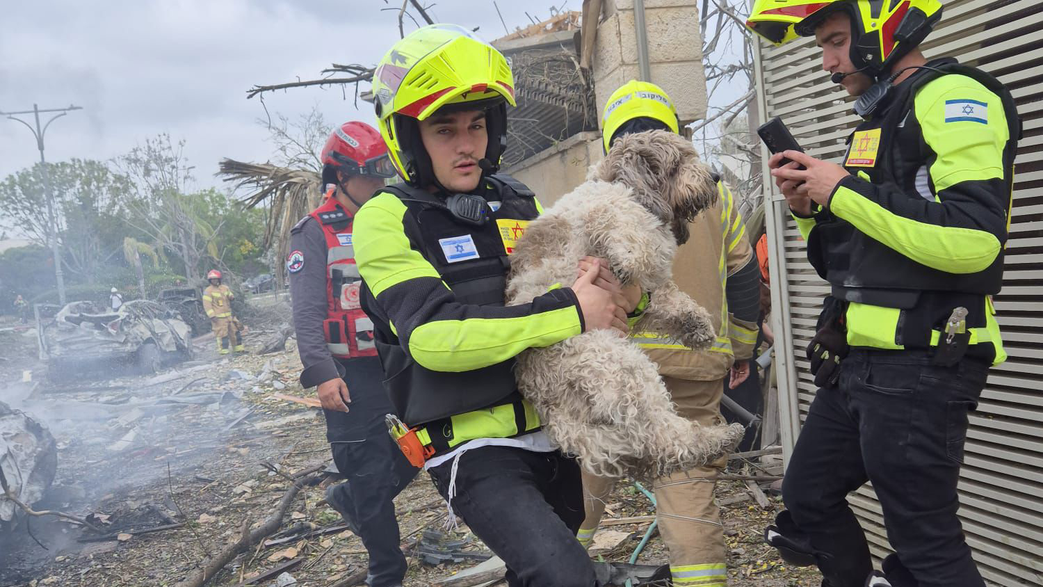 Quelques minutes plus tard, les pompiers ont réussi à sauver un couple âgé piégé au sous-sol — un homme et une femme d’environ 65 ans, avec des blessures légères. Avec d’autres équipes du Maguen David Adom, je leur ai prodigué les premiers soins sur place, puis j’ai vu le chien de compagnie du couple parmi les décombres.