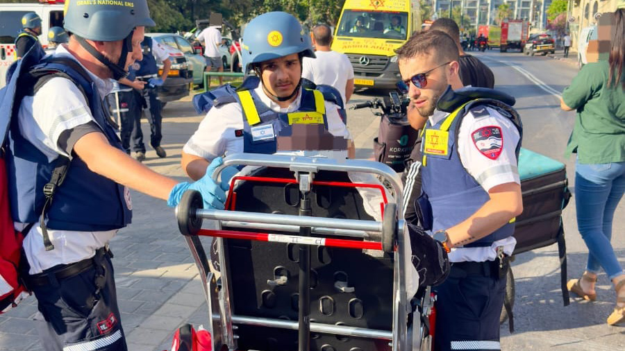 Les ambulanciers et paramédics du Maguen David Adom prodiguent des soins et évacuent vers les hôpitaux deux personnes en état sérieux — un homme d’environ 80 ans et une femme de 70 ans — ainsi que 30 personnes en état léger, souffrant de blessures par explosion et éclats. D’autres équipes assurent les soins à plusieurs blessés sur différents sites.